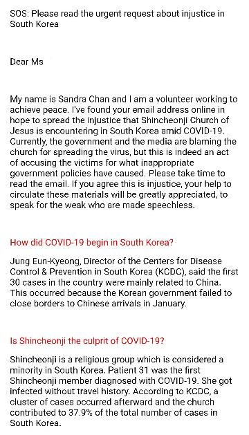 이는 신천지나 현 정부나 우리 사회 모두에게 불행한 악운이라 봐야지, 신천지가 악의를 가지고 퍼뜨렸다고 주장하기 위함이 결코 아님을 말하고 싶습니다.