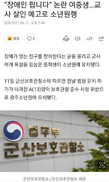 [엽기유머] "장애인 팝니다" 논란 여중생. 교사 살인 예고